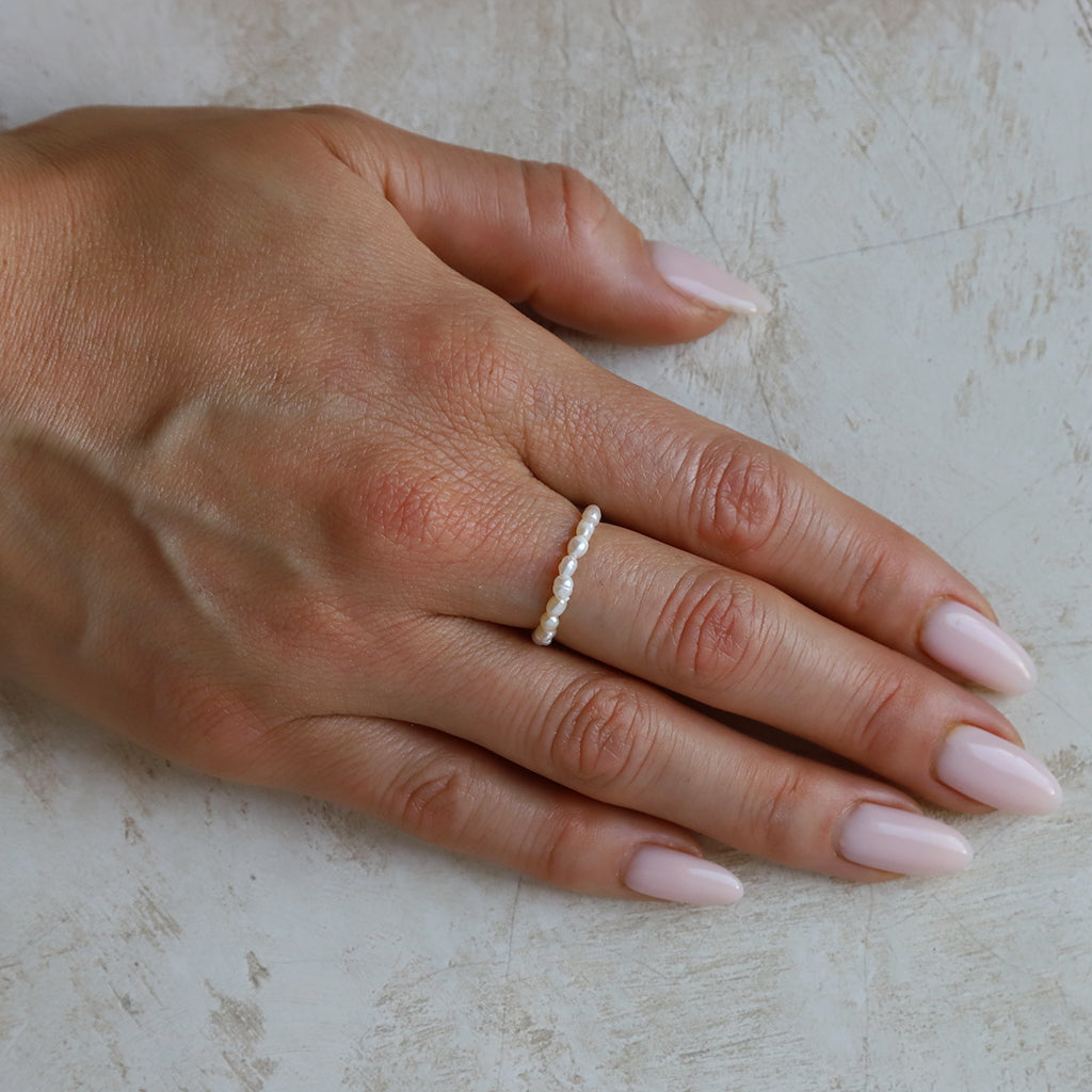 Chiquito Small Pearl Ring features tiny pearls perfect for layering and stacking.